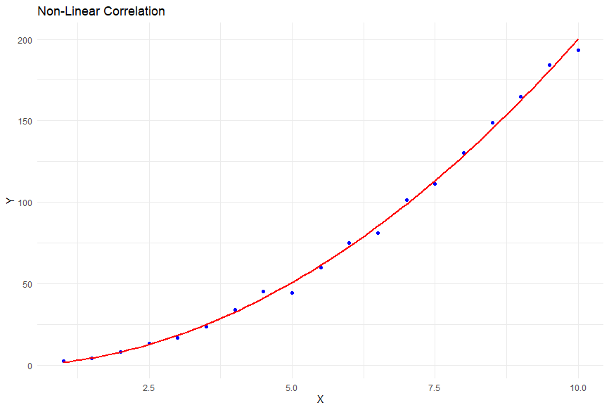 Before we determine if the increase in water consumption is correlated with an increase in saliva, like any other statistical test, we need to satisfy certain assumptions for a Pearson correlation test. Firstly, the variables of interest should be continuous. Secondly, the relationship between the variables should be linear, meaning the data points tend to follow a straight line pattern like the figure above (ie., as one variable goes up or down, so does the other in a way that isn’t a square root, exponent, logarithm, etc). An example of a non-linear correlation is in the figure below. Lastly, we assume that the variables are normally distributed, meaning they follow a bell-shaped curve, like so many of the other statistical tests we’ve mentioned.