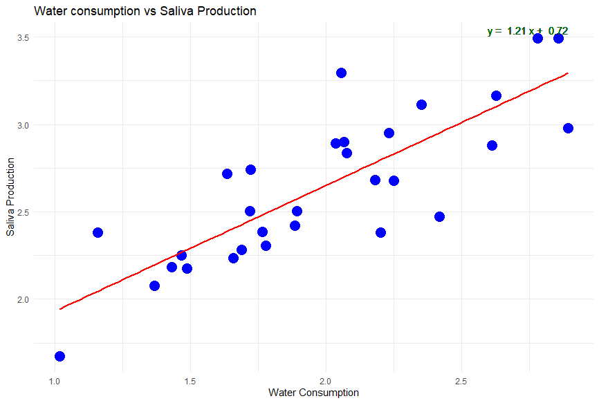 Here, x is your independent variable and y is your dependent variable, with m being the slope AKA the rate of change. The lines on the scatterplots above have been calculated to best fit the data and are the best line to match the rate of change between variables. If the regression line is saliva production = 1.21(water consumption) + 0.72 (like the scatterplot below), you can estimate with every increase of 1 liter in water consumption, there is most likely an 1.21 liter increase in saliva production starting at minimum of 0.72 liters of saliva that will be produced.