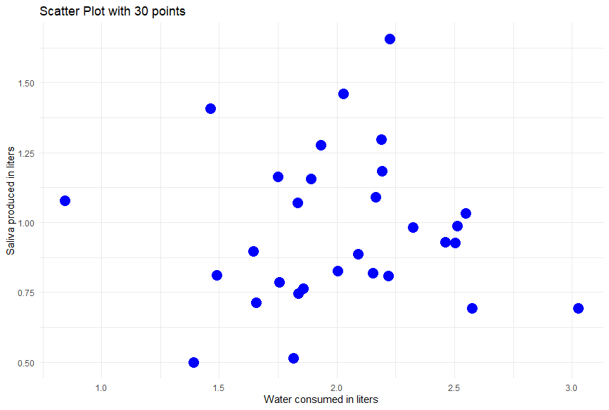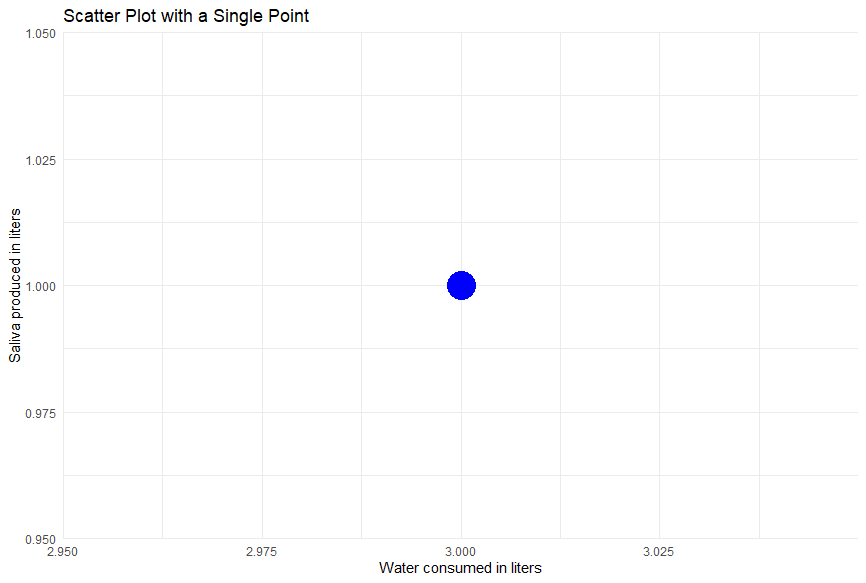 Let’s say we plot two dog-related continuous variables on a graph: water consumption and saliva production. You might assume that the more water a dog consumes is associated with higher saliva production. We do our magical testing of many dogs per usual to determine their water consumption and saliva production. We plot water consumed on the x-axis of a graph and saliva production on the y-axis. Each dog has a value for both of these values, and where they meet on the graph is where we put a point. Let’s say 1 dog consumes 3 liters of water and produces 1 liter of saliva. We would move to 3 on the x-axis and up 1 on the y-axis to place our point