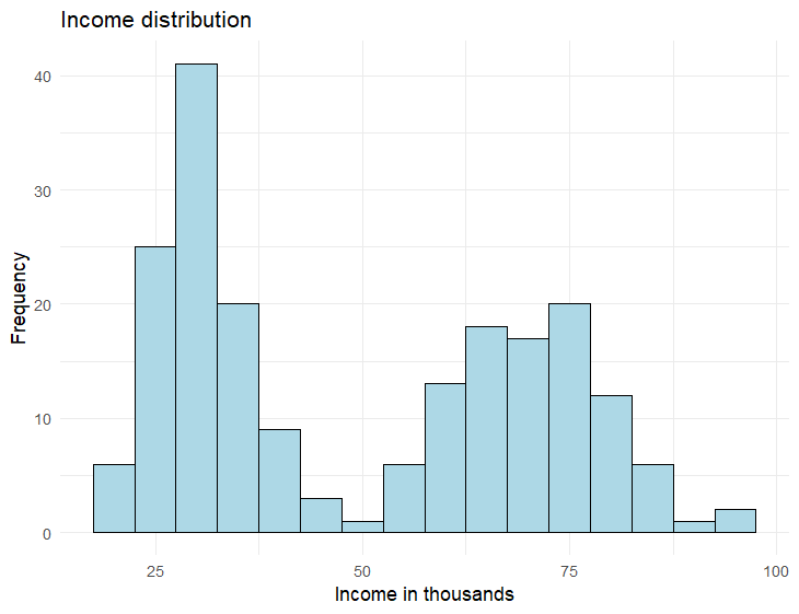 If you sampled a small tech company about their employees’ incomes, you might have a distribution like the one below. This bimodal distribution indicates suggests there are two possible groups occurring in the data. Perhaps the spike on the left reflects the employees who have worked for the company for less than 5 years while the spike on the right reflects senior management. Perhaps measuring employee income isn’t the best variable to assess then, but it might be useful if looking only at newer employers, senior employers, or comparing these two groups with a t-test, but income distribution like it is below would not be a good variable to use for correlation testing.
