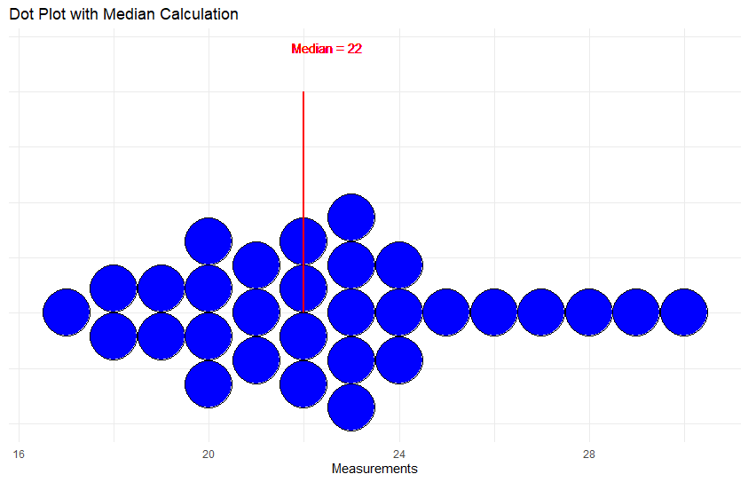 The median is the middle measurement of the sample we took. To do this, we would sort all of our measurements from lowest to highest and then start crossing off the outer numbers (eliminate measurement 1 then 30 then 2 then 29) until we are left with 1 number in the middle, In our case with 30 numbers, we will not have one middle number. Instead, we would have measurements 15 and 16, and in this case, we would average the values of these numbers together to create the median. For example, if the 15th measurement was 21 inches and the 16th measurement was 22 inches, we would average those measurement values to achieve a median of 21.5 inches. You could imagine this process would take a long time for larger samples (and samples could be in millions)- fortunately computers are great at finding medians.