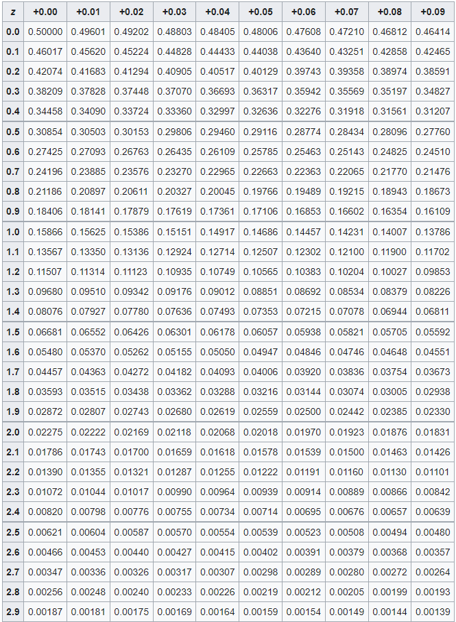 That’s wonderful that we can have a standardized z-score, but the usefulness of a z-score comes from translating the z-score into a probability value (p-value). In the table below, you can see that as you increase the z-score by 0.1 (in the rows) or by 0.01 (for each column) the values inside the table decreases. The values inside the table are indeed p-values! Let’s say we had a z-score of 2.14- would first go down the row until we see 2.1, then go right to the +0.04 column (in total we have 2.1 + 0.04, for a z-score of 2.14). Inside that cell, we have a p-value of 0.01618. This means that the probability of a z-score being higher than our z-score is 0.01618 or a 1.618% chance. That chance is pretty low!